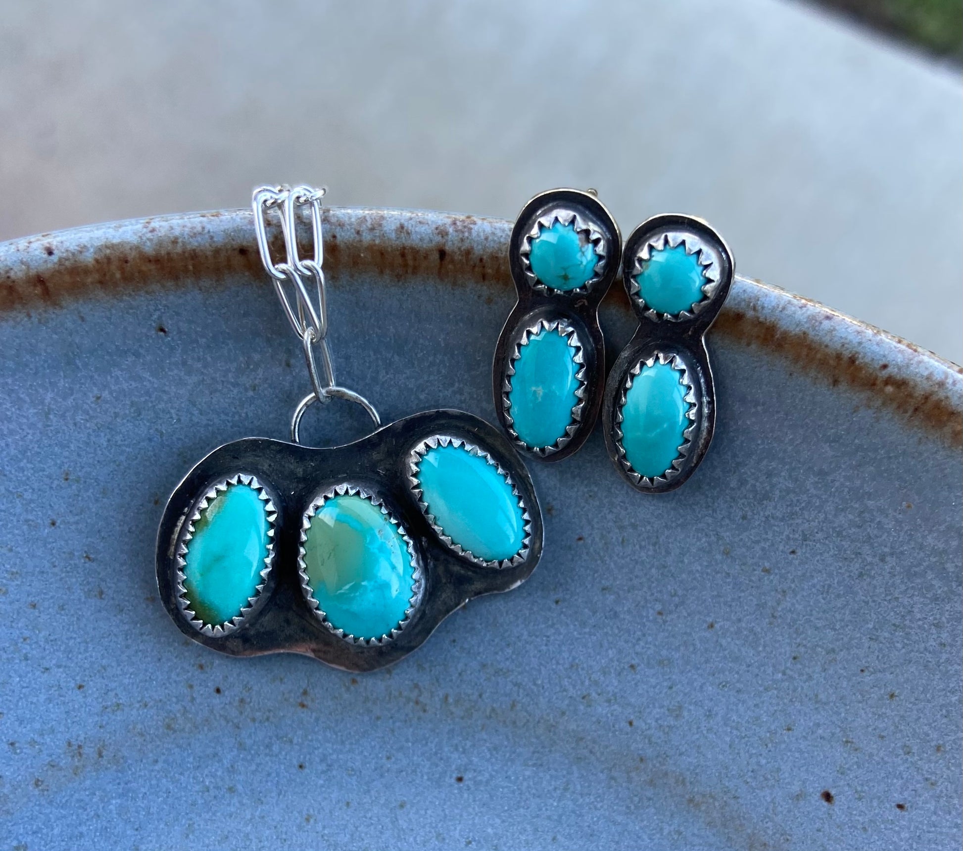 Carico Lake turquoise at its finest, if you ask me. All stones are very complimentary of each other. Earrings are studs. Necklace comes with 18” chain. Necklace charm measures roughly 1-1/4” by 3/4”. And the earrings are almost 3/4” long. Sterling silver. Handmade.