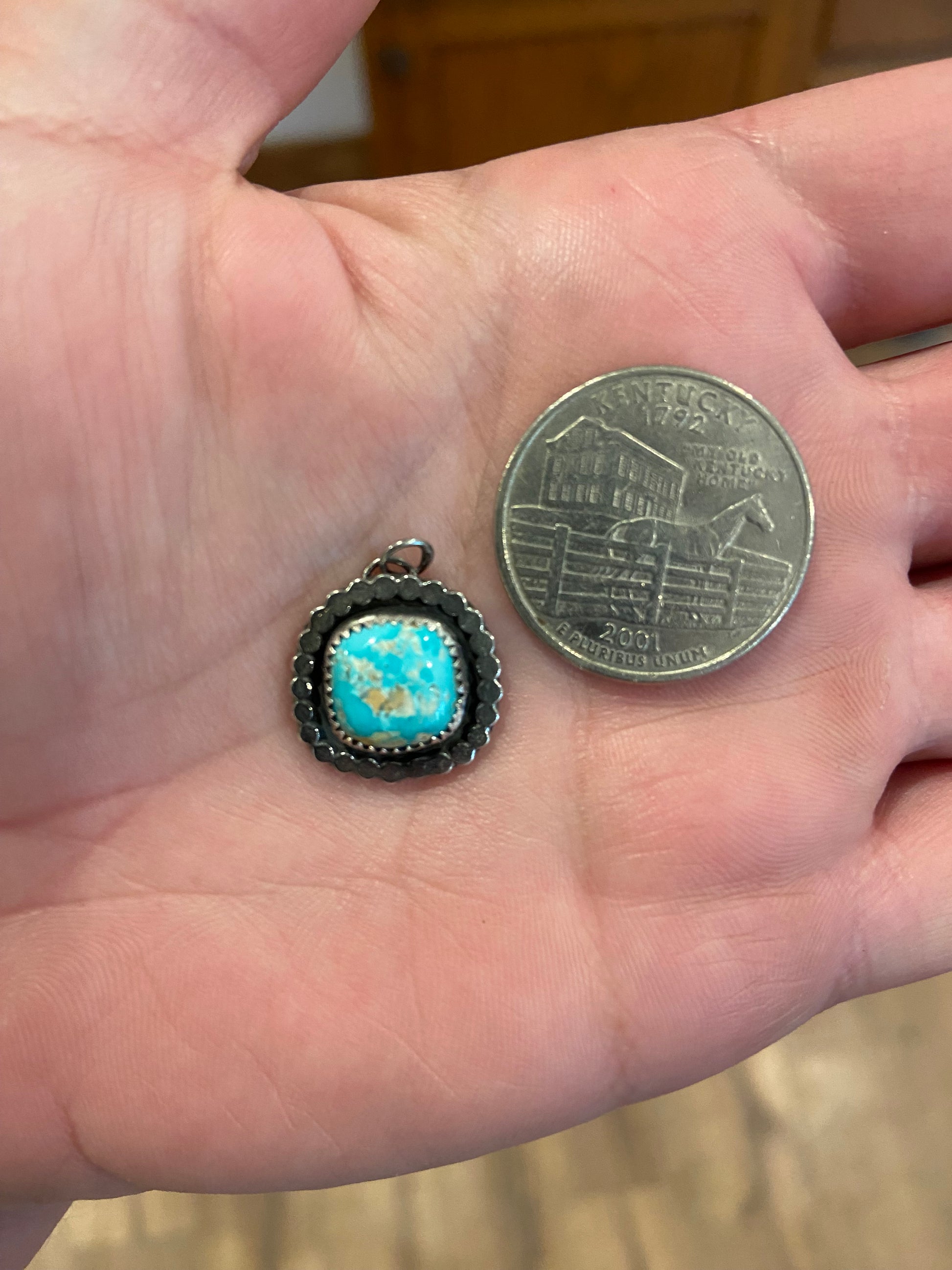Super cool Sierra Bella square stone with lOtis of matrix. This piece has a super cool vibe with this style border and the antique. Measures roughly 5/8” wide by 5/8” tall. Comes with 18” chain. Sterling silver.